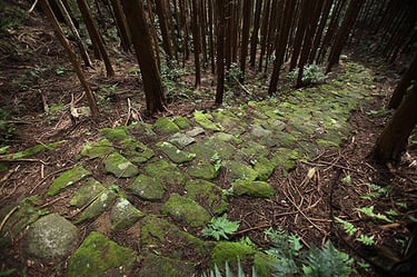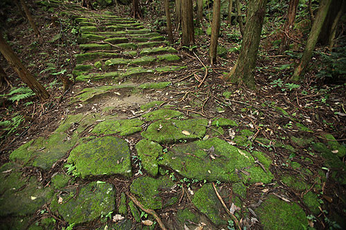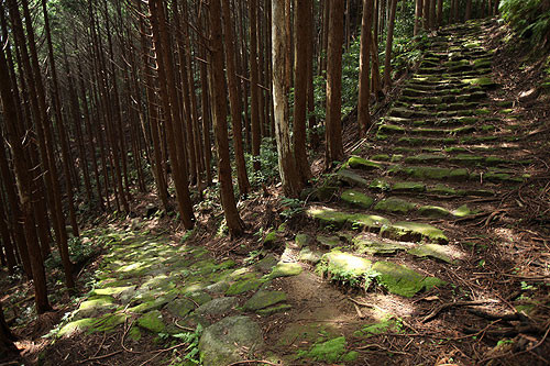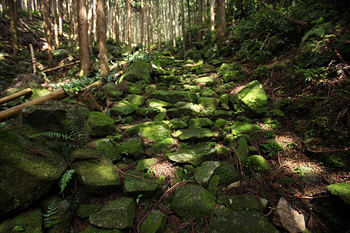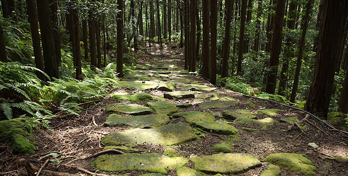 熊野市の二木島と新鹿(あたしか)を結ぶのが、二木島峠と逢神坂峠で、コースのほぼ直下をJR逢神坂トンネルが貫いています。杉と桧の山林を縫うように、ほぼ全区間に端正な石畳道が通じており、適度なアップダウンで爽快なハイキングが楽しめます。 逢神とは伊勢の神とと熊野の神が出会う場所という意味で、かつては狼が出没したことによるとの説もあります。