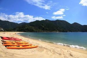 環境省の「快水浴場100選」に選ばれた、新鹿湾に広がる波穏やかなビーチです。どこまでも青く透き通った遠浅の海と白い砂浜が人気を呼び、シーズンになると多くの人で賑わいます。