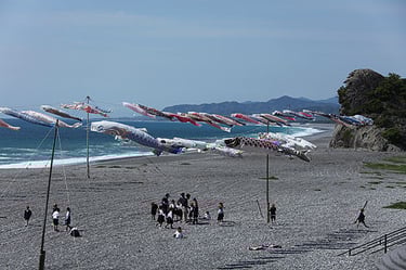 七里御浜海岸で獅子岩付近から熊野市駅口交差点前までのおよそ1kmにわたりに約200匹の鯉のぼりが泳ぎ、連休中に訪れる人を迎えます。